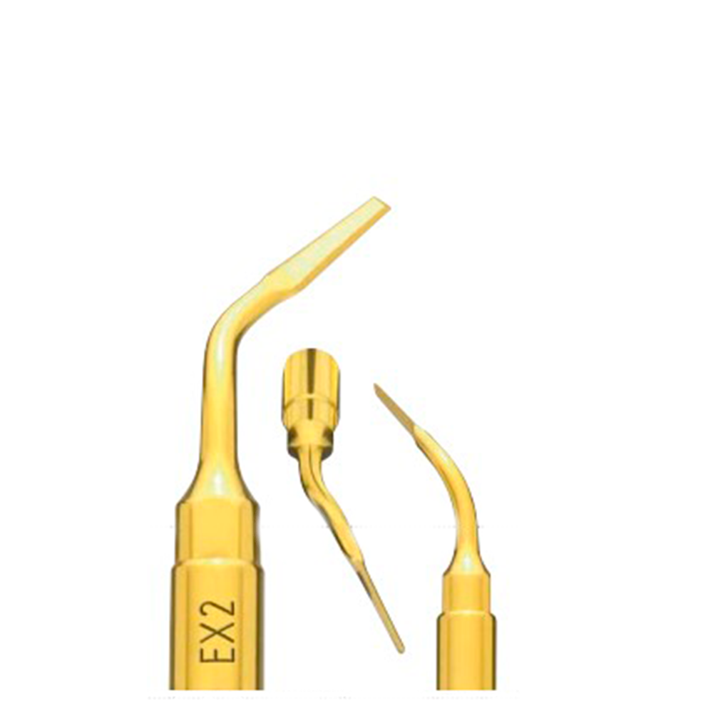 A ponta cirúrgica Mectron EX2 é banhada em Nitreto de Titânio. Este insert é angulado à esquerda por isso, é ideal para exodontia em regiões posteriores.