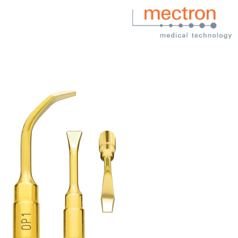 A ponta cirúrgica Mectron OP1 é banhada de Nitreto de Titânio. Esta ponta é utilizada para raspagem óssea em lasca e nivelamento ósseo.