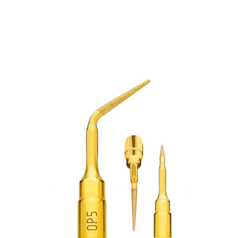 A ponta cirúrgica Mectron OP5 é utilizada em cirurgias periodontais fazendo descamação, micro desbridamento, desbridamento e alisamento radicular e perfuração óssea. Além disso, possui a sua extremidade diamantada e superfície banhada em Nitreto de Titânio.